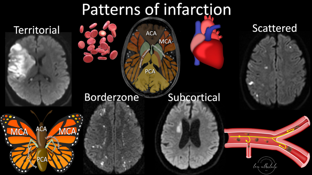 Patrones de infarto cerebral, “ACA, MCA, PCA” hacen referencia a arteria cerebral anterior, media y posterior, que irrigan el encéfalo en forma de “mariposa”.